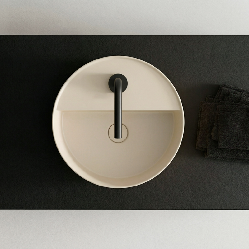 Универсальный тип установки: может монтироваться как накладная на тумбу/консоль или как подвесная на прочных металлических кронштейнах (в комплект не входят). Круглая форма, диаметр чаши — 45 см, оптимальная глубина предотвращает разбрызгивание воды. Предварительно выполненное технологическое отверстие стандартного диаметра для удобной установки смесителя на саму раковину. Песочное матовое покрытие (саббия) подчеркнёт характер интерьера. Подходит как для дизайна квартир, так и для оснащения гостиниц, офисов или загородных домов.