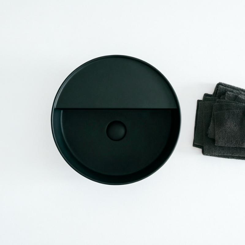 Универсальный тип установки: может монтироваться как накладная на тумбу/консоль или как подвесная на прочных металлических кронштейнах (в комплект не входят). Круглая форма, диаметр чаши — 45 см, оптимальная глубина предотвращает разбрызгивание воды. Чаша выполнена без технологических отверстий — чистая форма подчёркивает минималистичную эстетику и предполагает использование настенного смесителя для безупречного визуального эффекта. Черное матовое покрытие — легко сочетается со смесителями и современной сантехникой. Подходит как для дизайна квартир, так и для оснащения гостиниц, офисов или загородных домов.