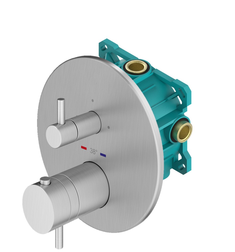 Комплект KITPSС02CS для душа, со встраиваемым коаксиальныи термостатическим смесителем для душа на 2 выхода PSB1802CS, с внутренней частью PSB003, накладка нержавеющая сталь d.160мм, браш хром PSBOX, излив 210мм, ручной душ Plumberia Selection