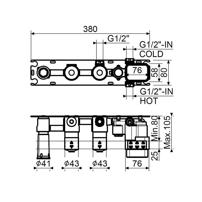 XMT001 Встраиваемая часть смесителя , ТЕРМОСТАТ для арт.XMT1801.., на 2 выхода, расположение горизонтальное, Modular IXO, Plumberia Selection