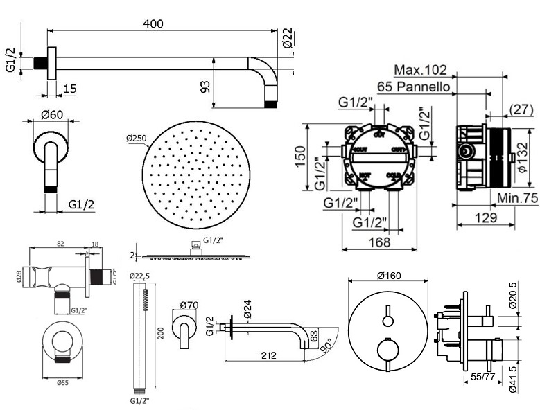 Комплект KITPSC1803BO для душа, со встраиваемым коаксиальныи термостатическим смесителем для душа на 3 выхода PSB1803BO, с внутренней частью PSB003, накладка нержавеющая сталь d.160мм, ручной душ и излив 210мм, верхний душ 250мм, белый матовый PSBOX, Plumberia Selection
