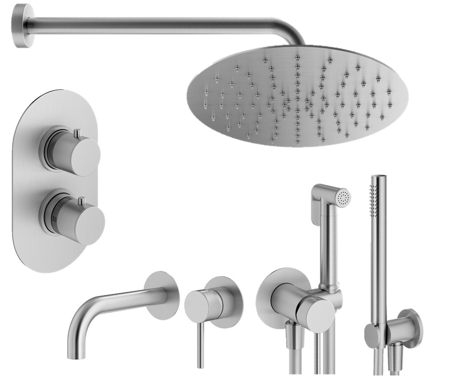 Комплект KITZXOT18CS210 с гигиеническим душем, со встраиваемым смесителем для раковины KITXO1135CS210, смесителем для душа XOT5040CS термост. на 2 выхода, верхний душ 250мм, IXO, брашированный хром PLUMBERIA SELECTION