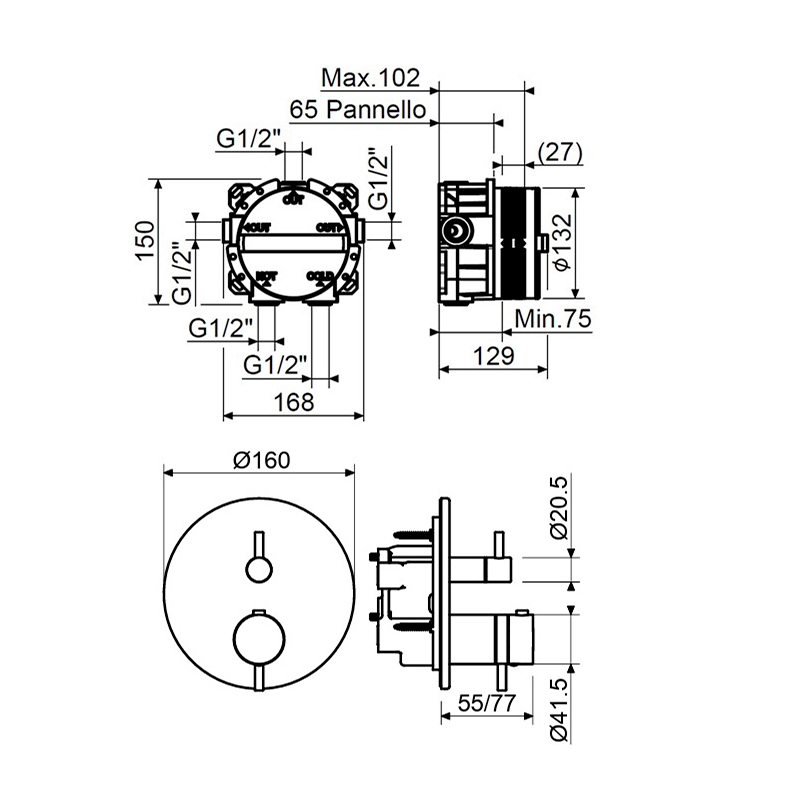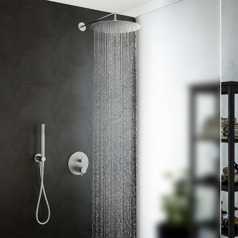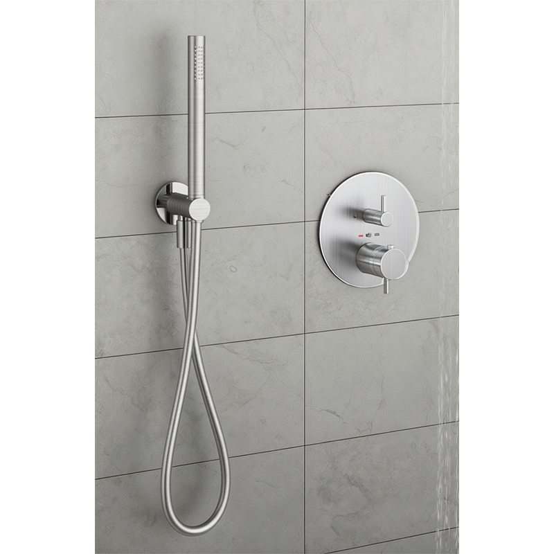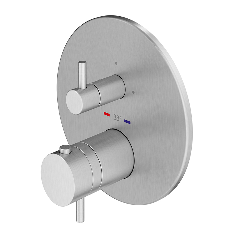 Комплект встраиваемого коаксиального термостатического смесителя для душа Plumberia Selection PSBOX KITPSB1803CS на 3 выхода с внутренней частью PSB003, накладка нержавеющая сталь d.160мм, брашированный хром