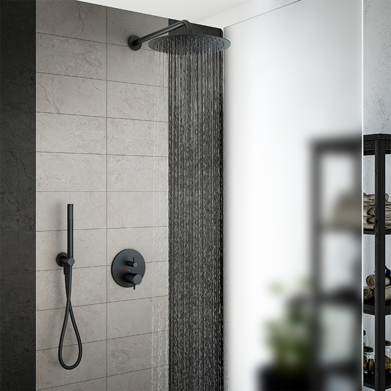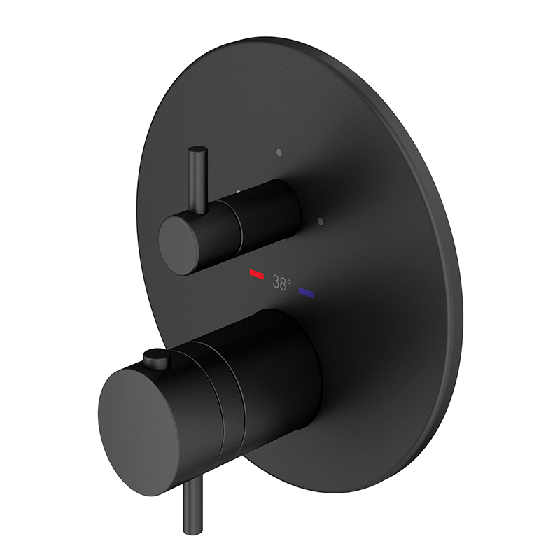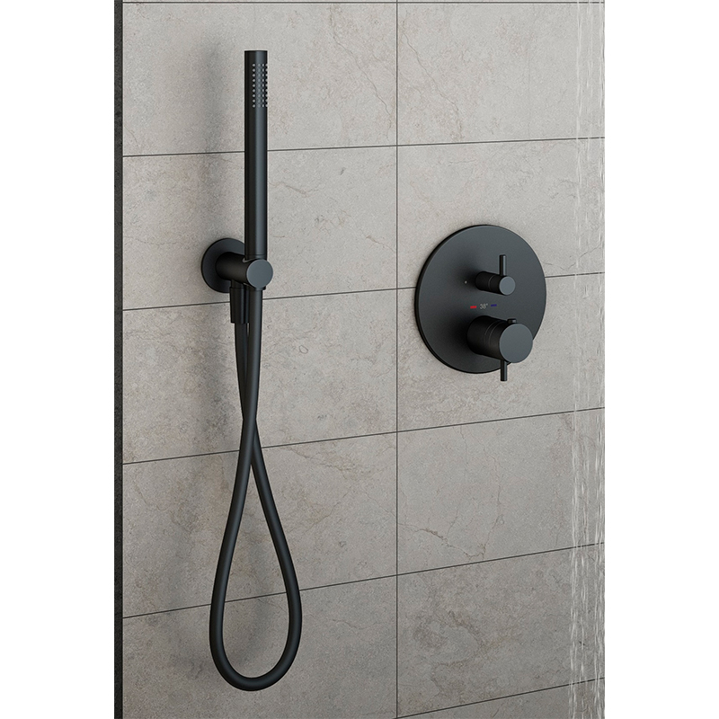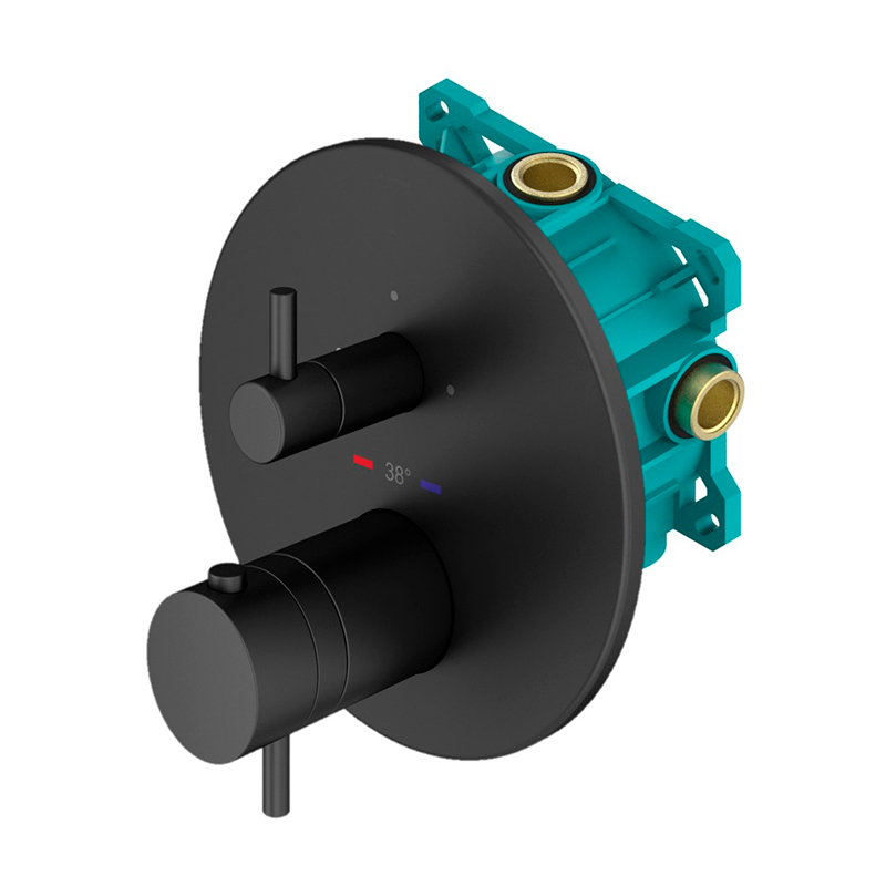 Комплект встраиваемого коаксиального термостатического смесителя для душа Plumberia Selection PSBOX KITPSB1803NO на 3 выхода с внутренней частью PSB003, накладка нержавеющая сталь d.160мм, черный матовый